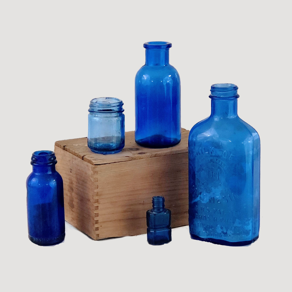 Variety of cobalt apothecary bottles. Perfect for bud vases or for adding extra touches of details.