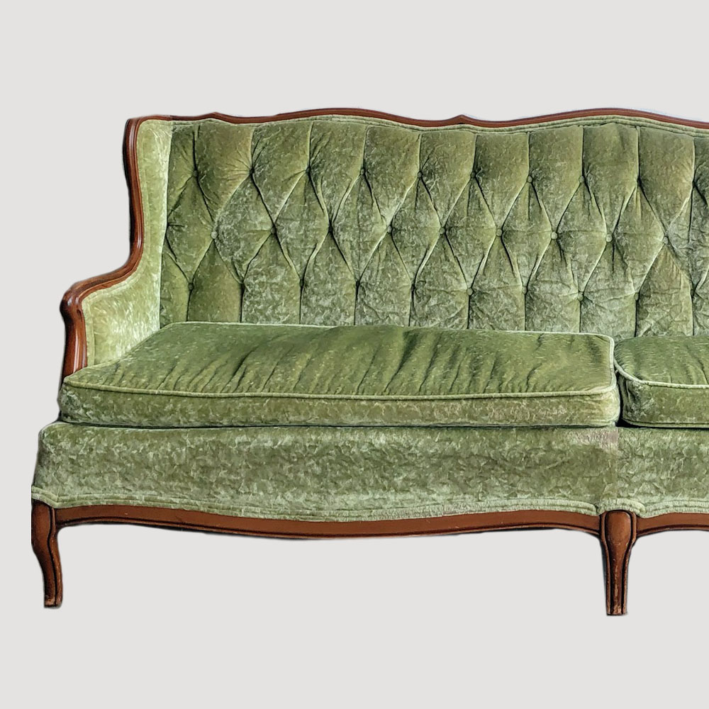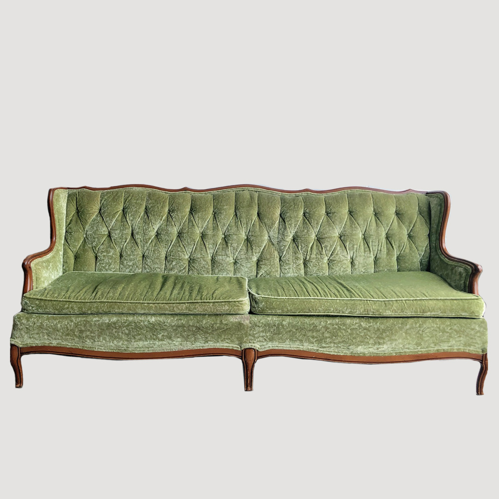 Description: Beautiful green velvet sofa! Great in a lounge or for bridal portraits