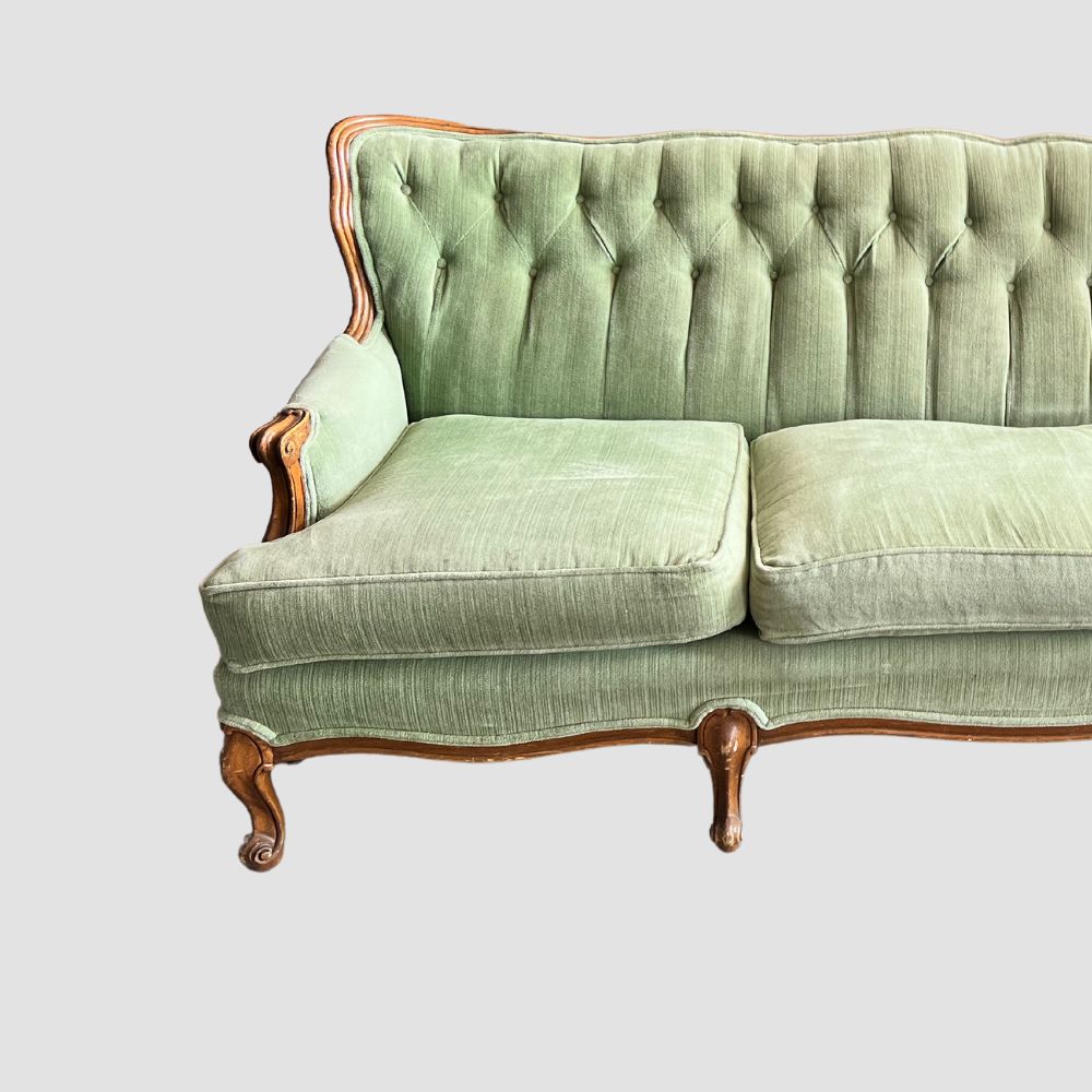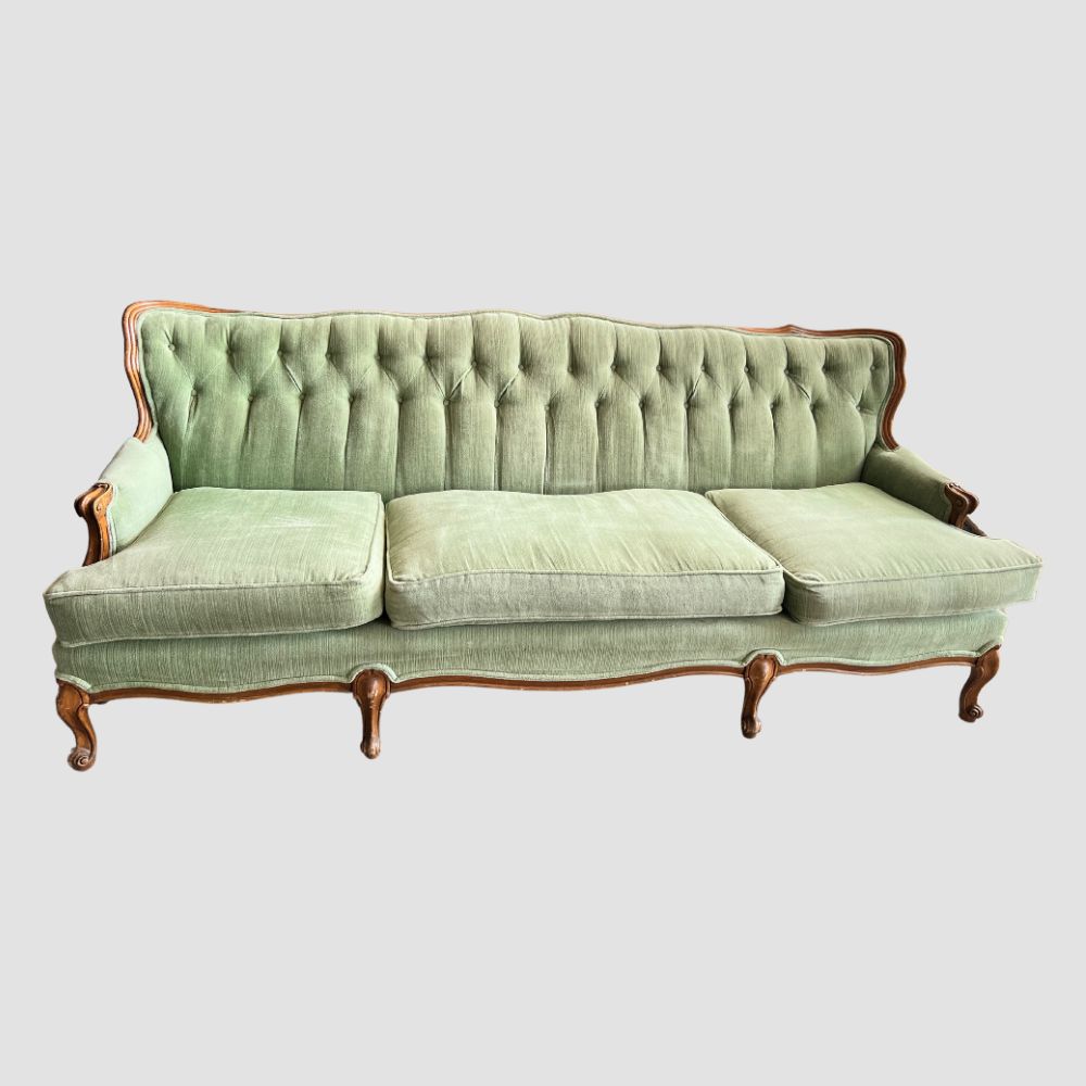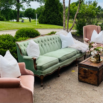 Description: Beautiful muted green sofa! Great in a lounge or for bridal portraits