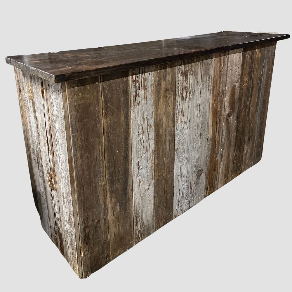 Description: Large rustic bar and stand for displaying drinks, desserts, wedding favors or as a bar!