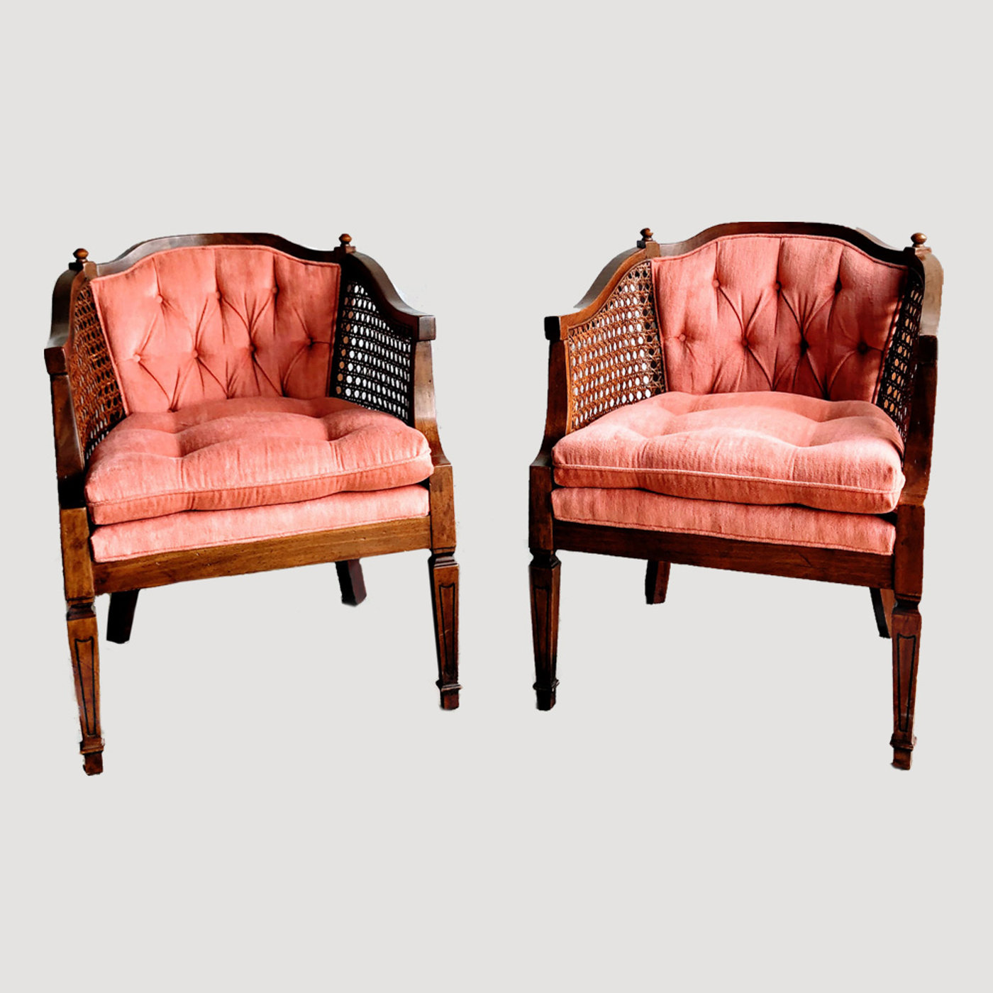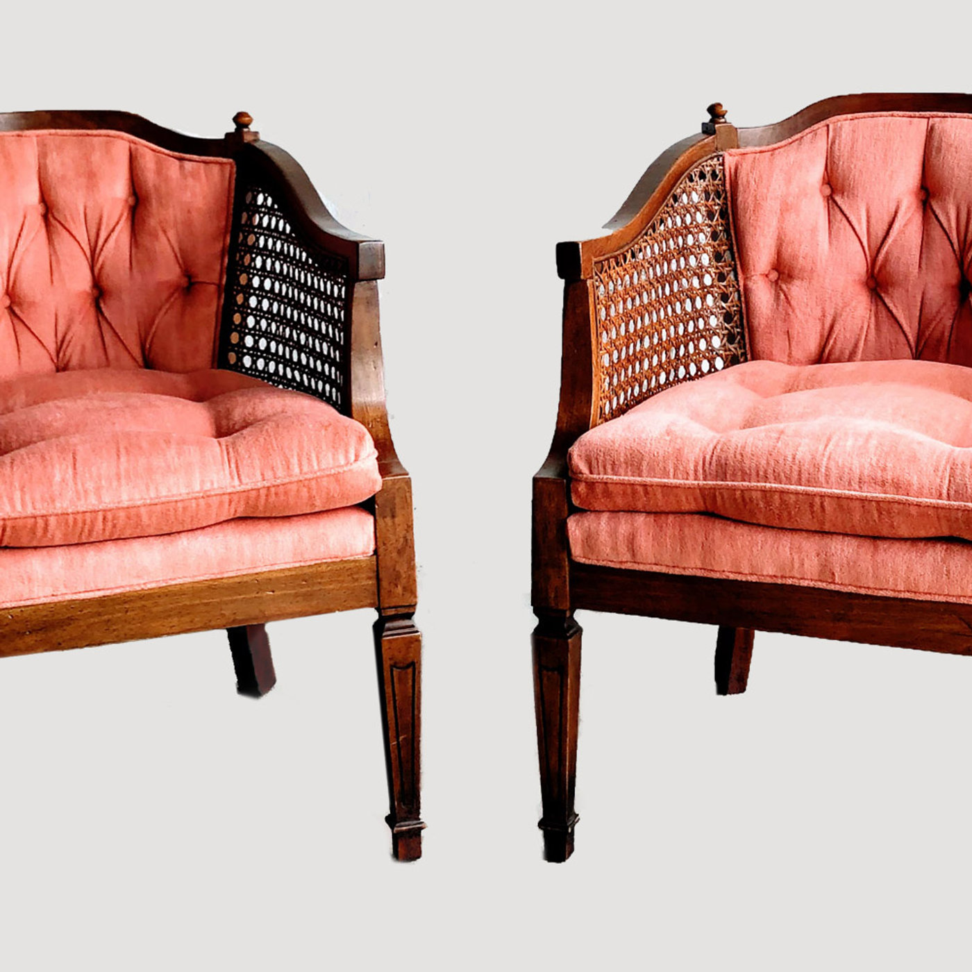 Description: Beautiful sorbet colored chair pair with cane accents.
