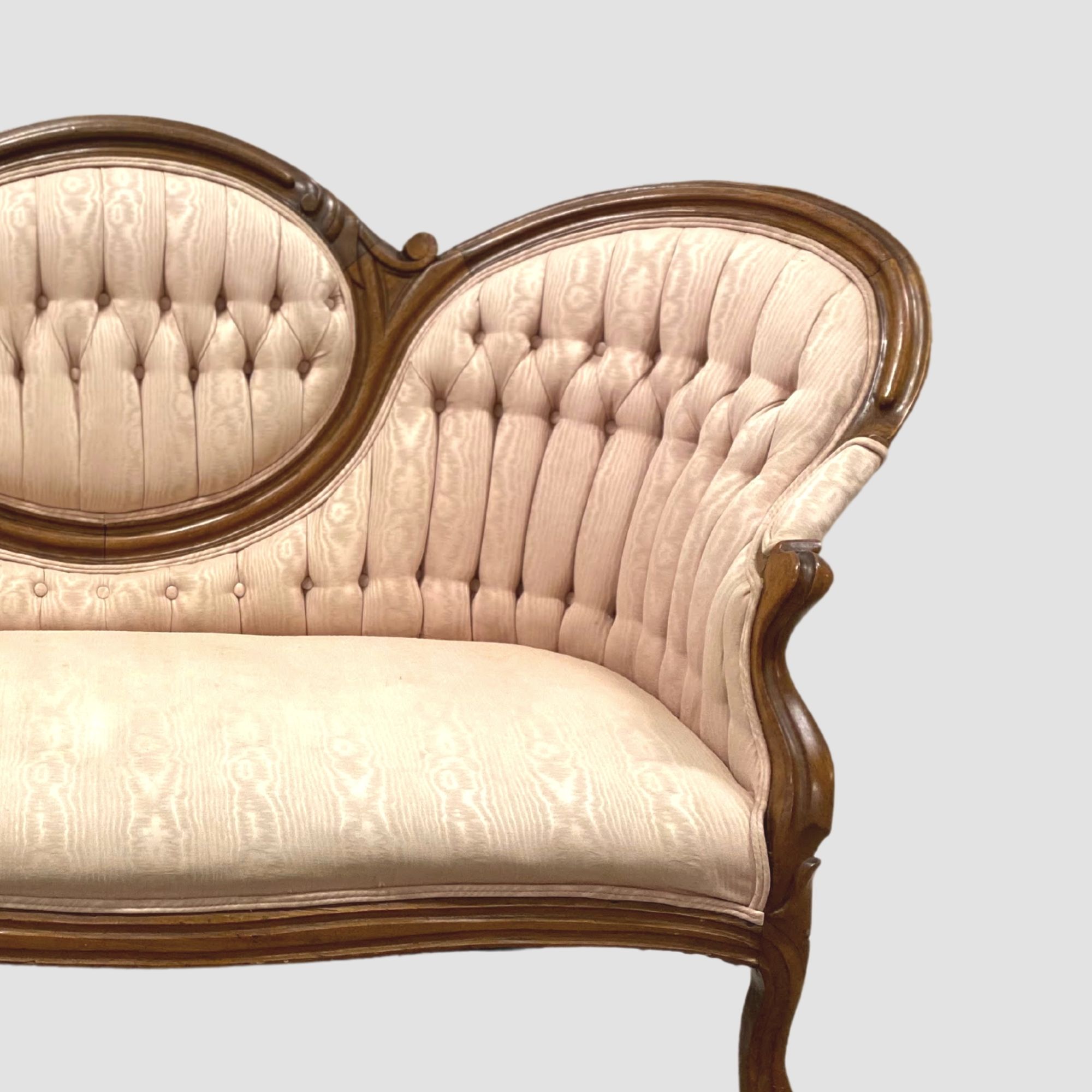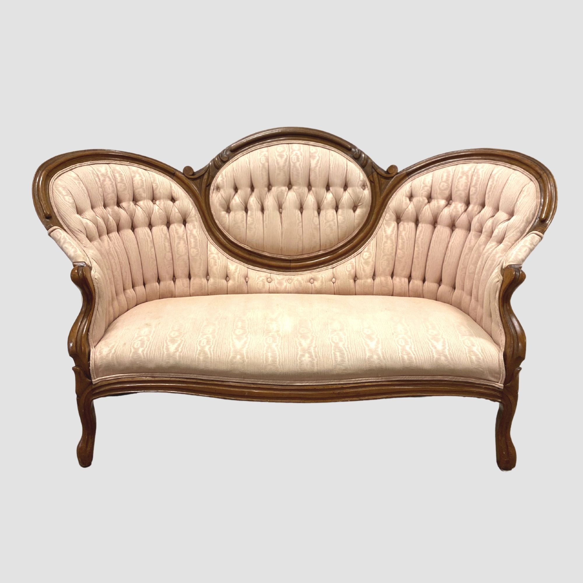 Description: Sweet petite velvet settee. Great for a smaller lounge space. Soft pink color.