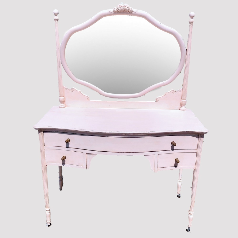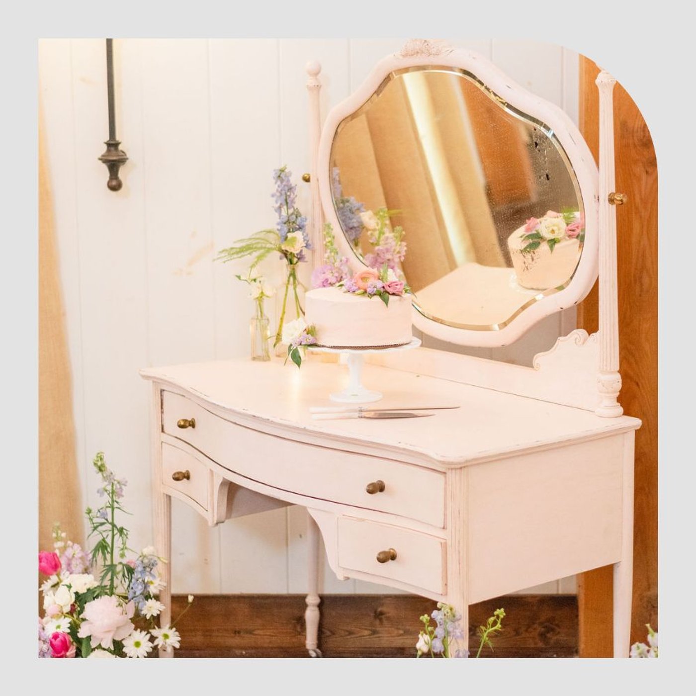 Description: Pink dresser. Use for cards/guest book table, dessert table or any other table needed for wedding. Leave mirror blank or add some writing for a fun message!